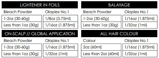 - Odmerajte OLAPLEX No.1 podľa tabuľky. Na odmeranie použite priložený dávkovač.