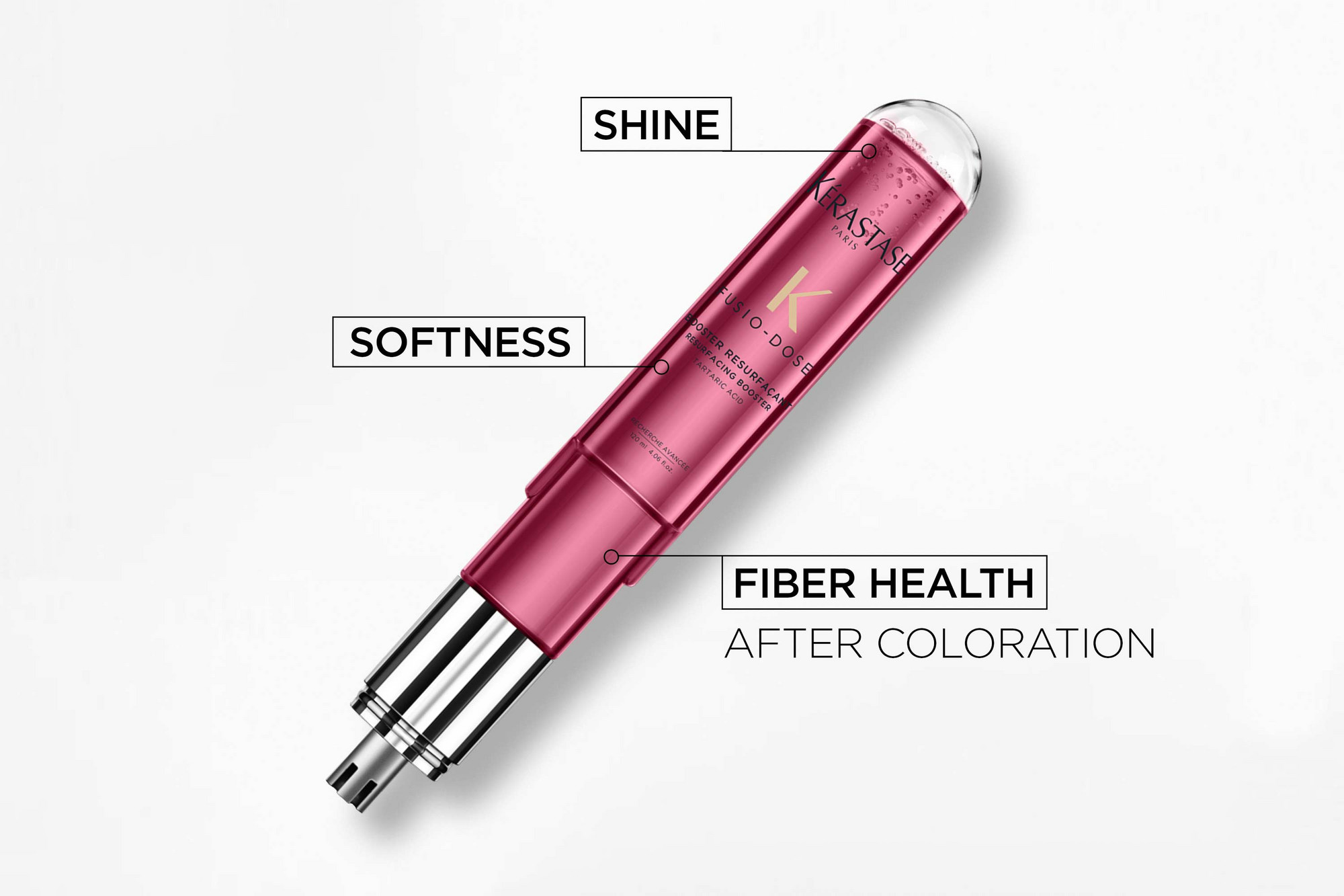 Vysoko koncentrovaný booster na regeneráciu a obnovu povrchu vlasového vlákna, redukciu poškodenia a rozjasnenia farbených vlasov. Určené pre všetky typy scitlivených alebo farbením poškodených vlasov. Navrhnuté na použitie s akoukoľvek koncentrovanou kúrou Fusio-Dose Concentré. Možno použiť ihneď po farebnom servise alebo medzi farbením.