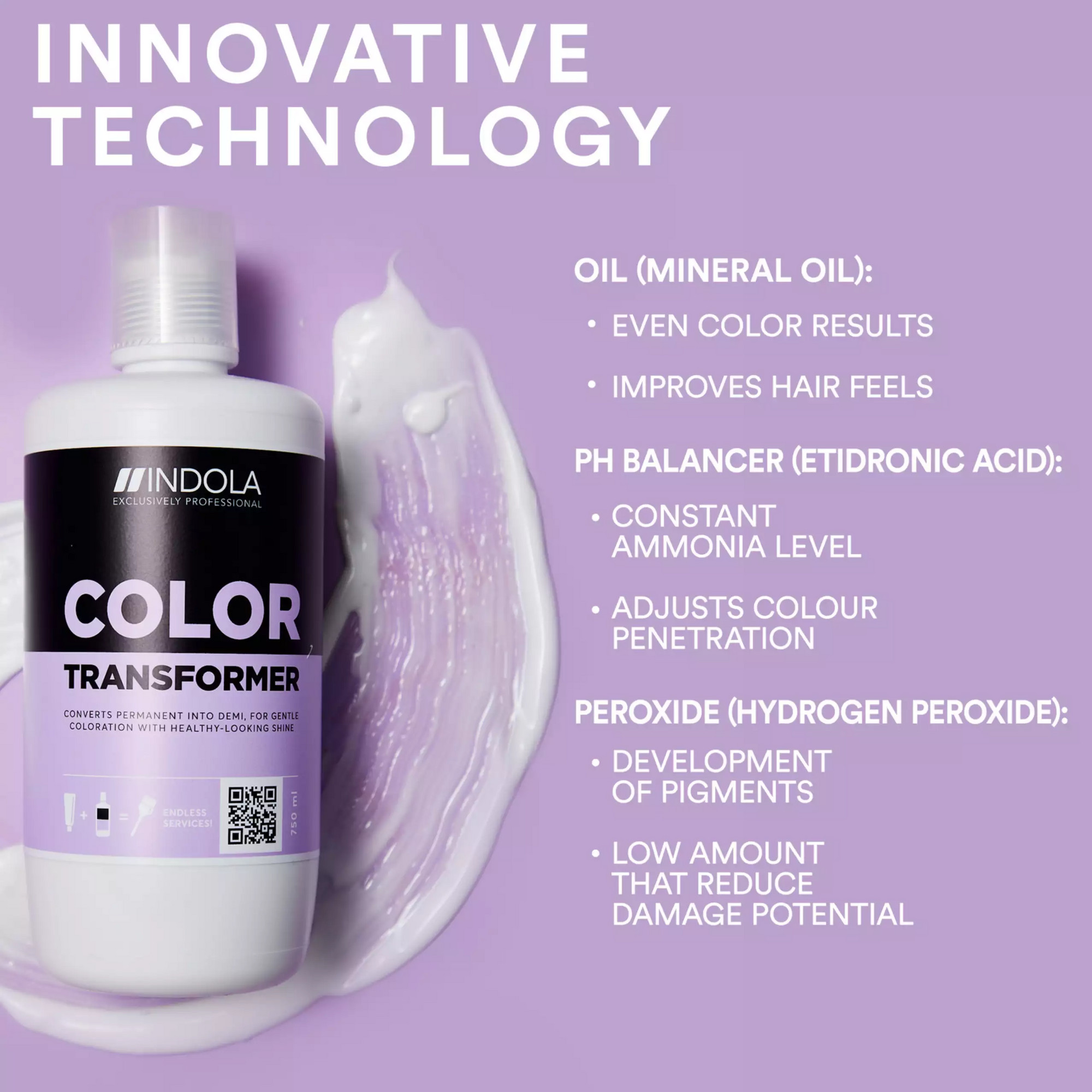 • Technológia Color Transformer – premieňa permanentné odtiene na demi-permanentné, vytvára vyvážený systém pre dosiahnutie požadovaných farebných výsledkov.