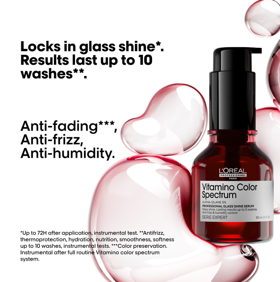Vitamino Color Spectrum Glass Shine Serum je patentované bezoplachové sérum od L’Oréal Professionnel, určené na farbené vlasy. Toto sérum poskytuje okamžitý ultra vysoký lesk a dlhotrvajúce výsledky až po 10 umytí. Je ideálny pre zaistenie ochrany farby, proti krepateniu a vlhkosti, a to vďaka unikátnej technológii obohatenej o 5% Alpha-silane. Po aplikácii sa vlasy okamžite stávajú viac hydratované, uhladené a hebké, pričom zachovávajú svoju farbu a lesk na dlhú dobu.