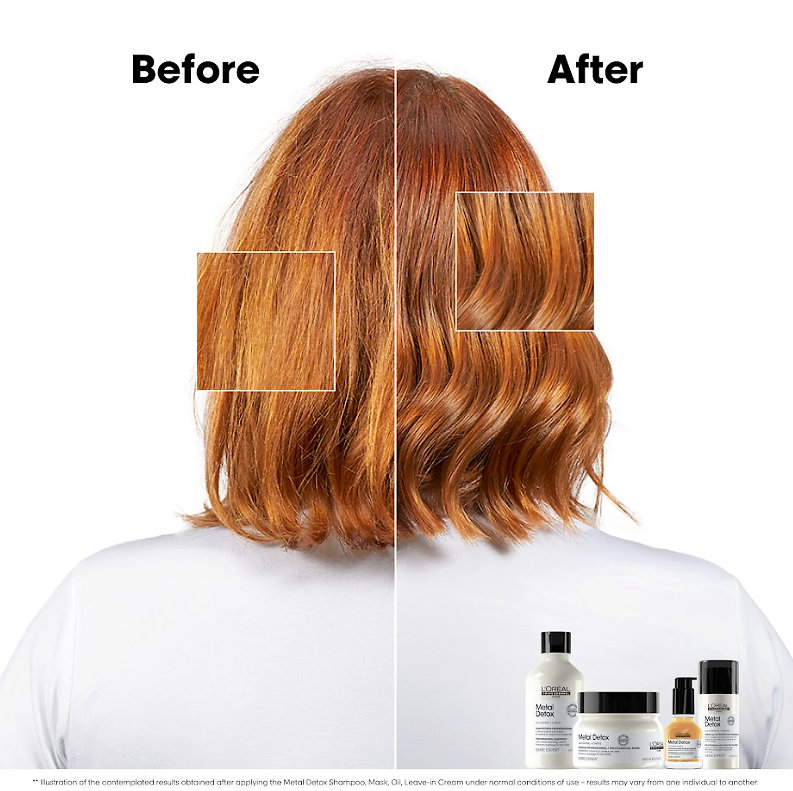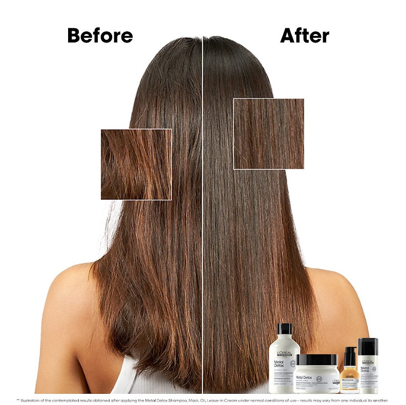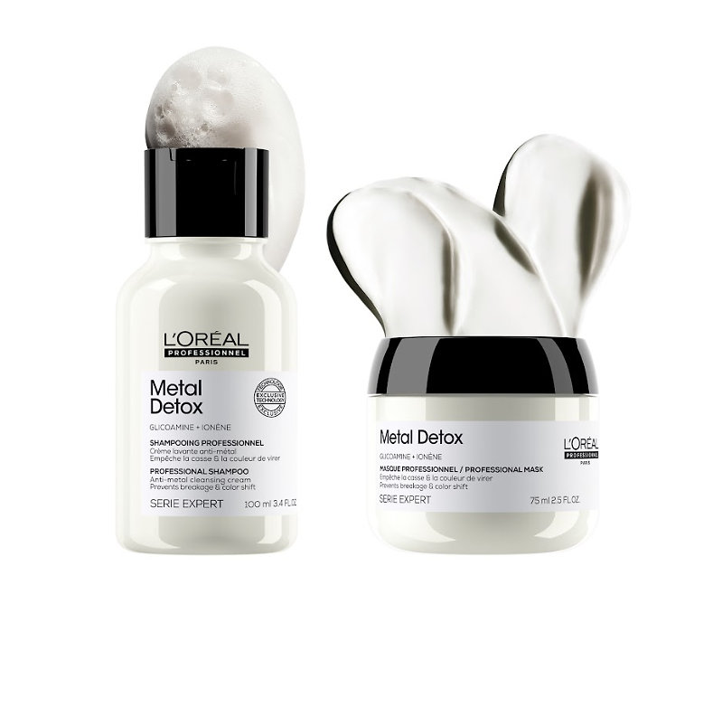 Cestovná sada pre farbené a poškodené vlasy L'Oréal Professionnel Séria Expert Metal Detox Mini Duo Kit - ideálna sada na cesty, ktorá chráni vlasy pred poškodením spôsobeným kovovými časticami. Tento profesionálny set obsahuje mini verzie šampónu a masky, ktoré pomáhajú neutralizovať kovové zvyšky velasov.