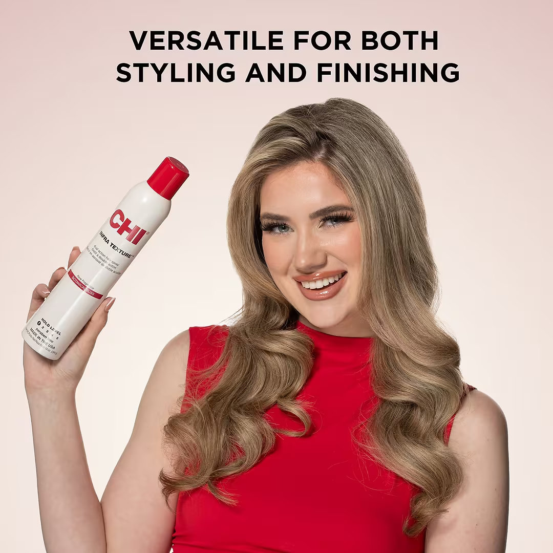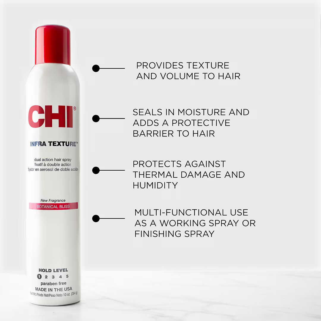 CHI Infra Texture Dual Action Hair Spray je rýchloschnúci lak na vlasy určený na styling a finálne zafixovanie. Pomáha vytvoriť objem, textúru a prirodzený pohyb, zároveň dodáva lesk a ľahkú kontrolu. Vďaka svojej univerzálnej receptúre je vhodný na rôzne typy stylingu a môže sa používať ako počas stylingu, tak aj ako finálny krok na zafixovanie.